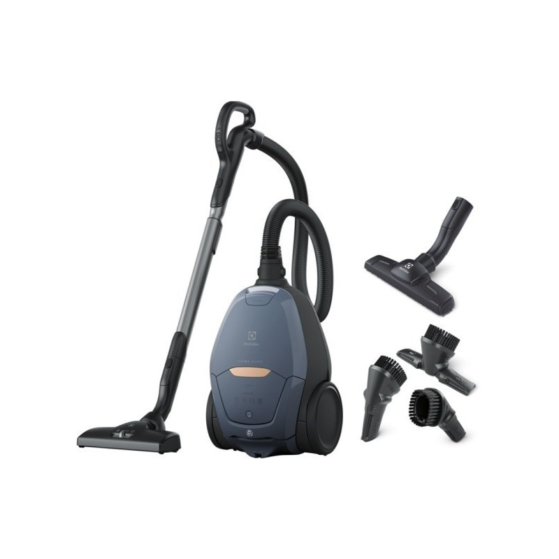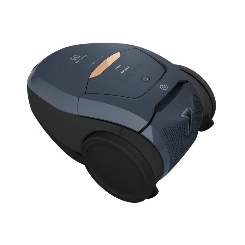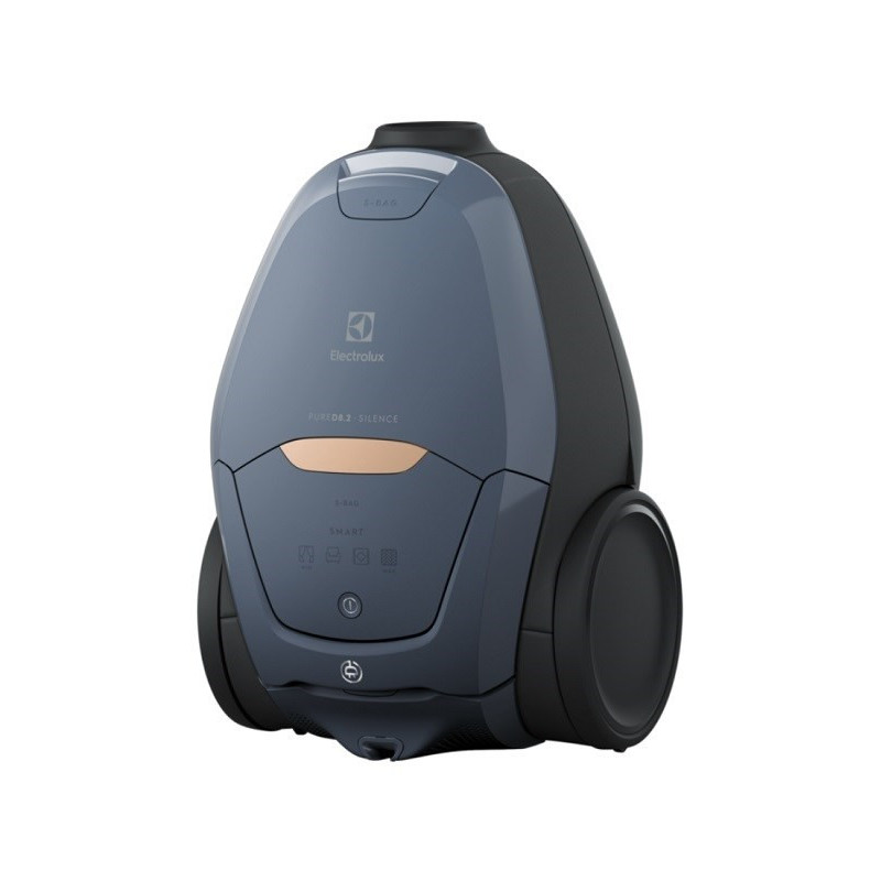 The ELECTROLUX PURE D8 PD82-8DB SILENCE vacuum cleaner features a 3.5 L dust bag capacity and operates at a maximum power of 500 W, with a noise level of 57 dB. It has a 12 m operating radius, is suitable for both hard floors and carpets, and includes a removable filter for effective air filtration.