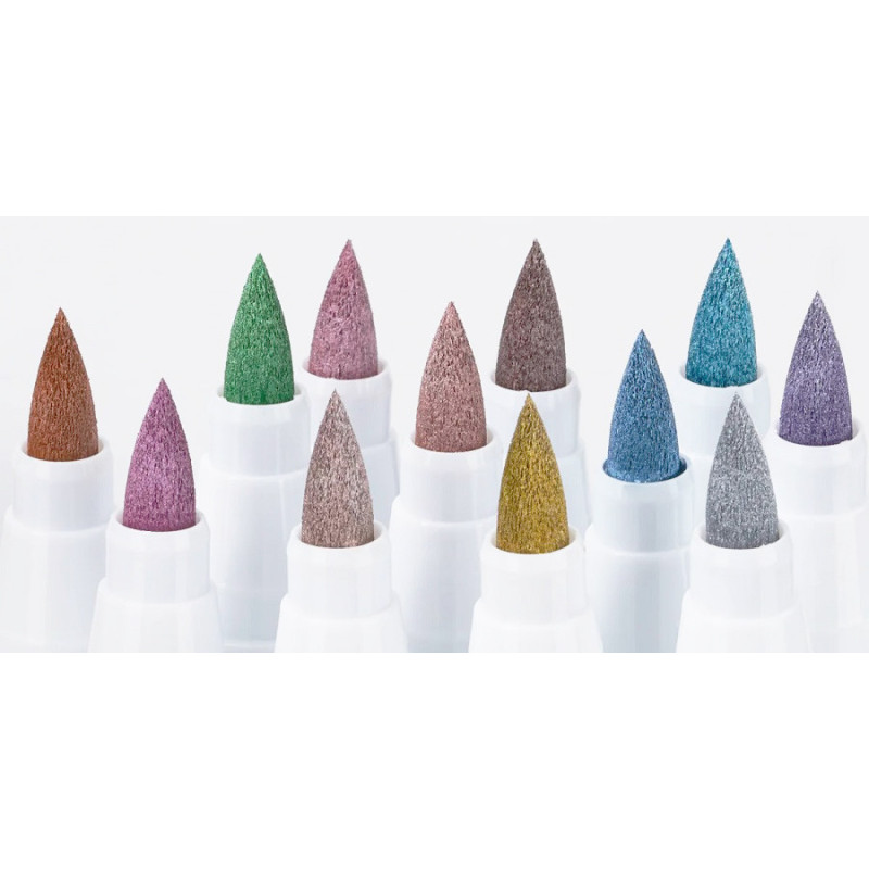 Komplektą sudaro 12 metalinių atspalvių flomasterių. Juos galima naudoti iškart, nereikia nei suplakti, nei spausti.