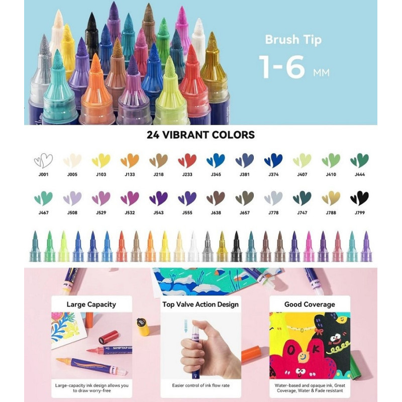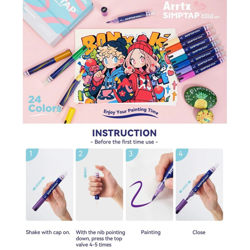 Aukštos kokybės ryškių spalvų akriliniai markeriai-flomasteriai ARRTX Simptap su spaustuku yra skirti piešti ant įvairių paviršių, tokių kaip kartonas, audinys, gipsas, metalas, stiklas, keramika, plastikas, medis, akmuo ir pan.