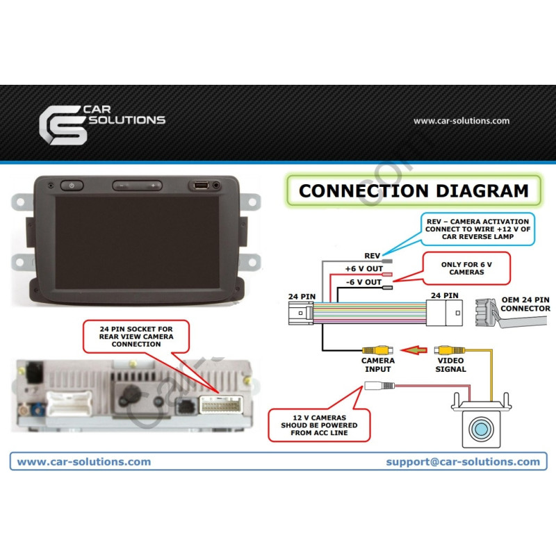 Gamyklos ypatybėsŠis adapteris yra originalus (OEM) galinio vaizdo kameros prijungimo kabelis, skirtas gamykliniams „Nav 1.0 Media“, „Nav 1.2 Media“ ir „Nav Evolution“ įrenginiams „Renault“, „Opel“ ir „Dacia“ automobiliuose. Šis „plug-and-play“ tipo kabelis panaikina poreikį pjauti laidus. Važiuojant atbuline eiga, galinio vaizdo kameros vaizdas bus automatiškai rodomas ekrane. Įrenginys prijungtas prie 24 kontaktų lizdo (kaip parodyta laidų schemoje). Prijungus, visos per šį lizdą veikiančios originalios (OEM) funkcijos išsaugomos. Ypač svarbu atkreipti dėmesį, kad galinio vaizdo kameros įvestį turi įjungti „Renault“ atstovas arba naudoti alternatyvią „Menaco“ arba „Menavrus“ programinę įrangą!