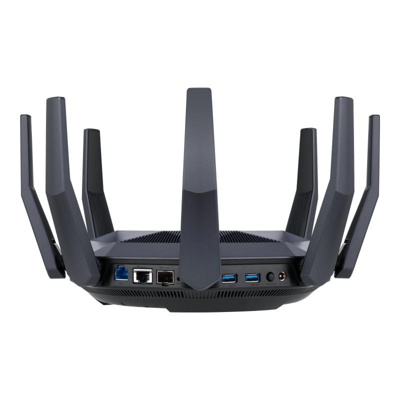 ASUS RT-AX89X yra 8-portų dviejų juostų belaidis maršrutizatorius, kurio bendras tinklo greitis siekia iki 6000 Mbps ir palaiko Wi-Fi 6 technologiją. Jame yra pažangi saugumo sistema AiProtection Pro, keli LAN prievadai ir dvigubos 10G jungties galimybės greitiems laidiniams ryšiams.