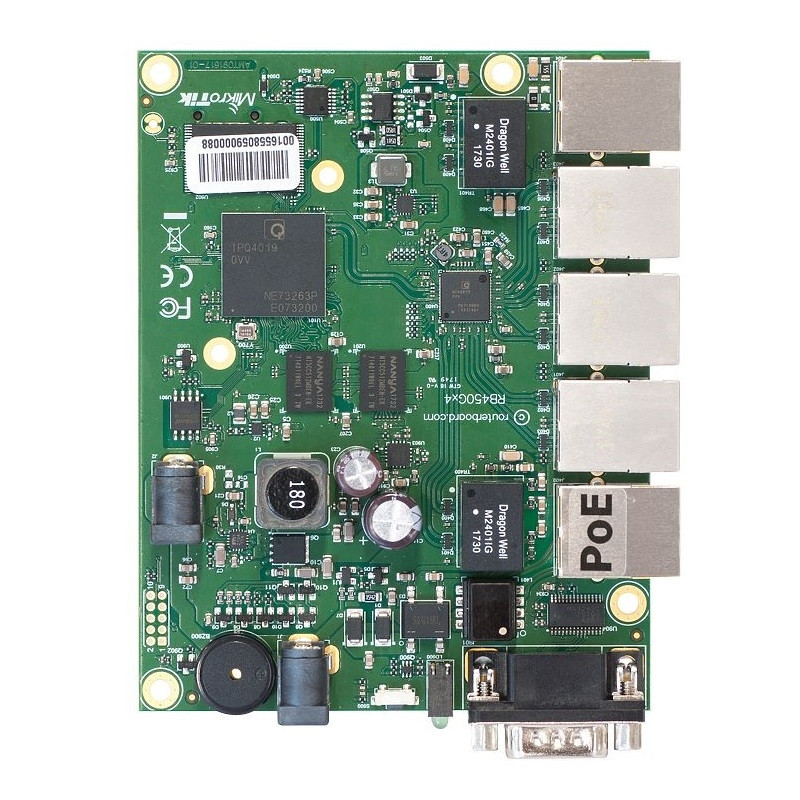 Product code: RB450Gx4 CPU: IPQ-4019 CPU nominal frequency: 716 MHz CPU core count: 4 Size of RAM: 1 GB Storage: 2 MB Flash, 512 MB NAND 10/100/1000 Ethernet ports: 5 PoE-in: 802.3af/at PoE-out: Passive PoE MicroSD slots: 1 Serial port: RS232 Supported input voltage: 10 - 57 V (two DC jacks), 12 - 57 V (PoE-in) Dimensions: 90 x 115 mm Operating temperature: -40°C .. +70°C tested Operating System: RouterOS (License level 5) Max Power consumption: 5 W