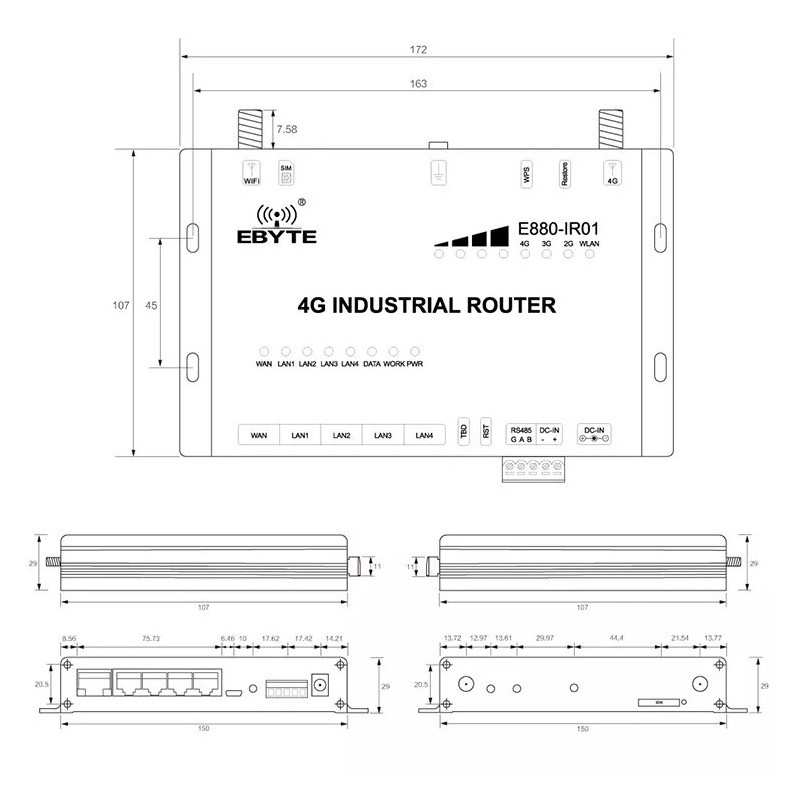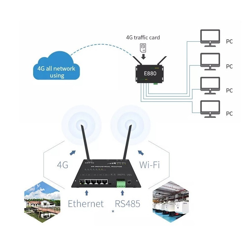 Pramoninis mobilus maršrutizatorius 4G/LTE palaiko 3G/4G mobiliuosius tinklus su duomenų perdavimo greičiais iki 150Mbps per Wi-Fi ir laidinius ryšius. Jame yra RS485 sąsaja, 4 LAN ir 1 WAN prievadai, veikia temperatūroje nuo -20 iki +70 °C.