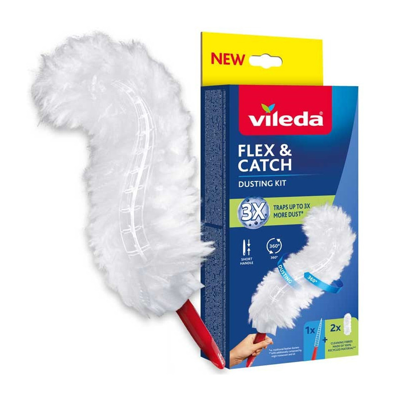 Vileda šluota pasižymi ergonomišku dizainu ir trumpa rankena, todėl ją lengva naudoti. Komplekte yra du Flex&Catch pakeitimai, pagaminti iš lengvai valomo technopolimero medžiagos.