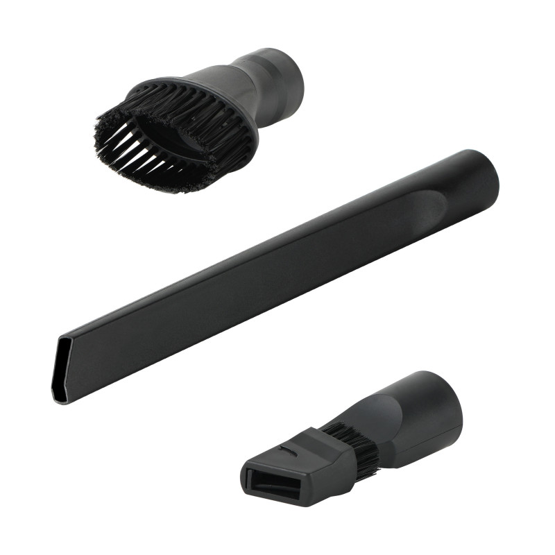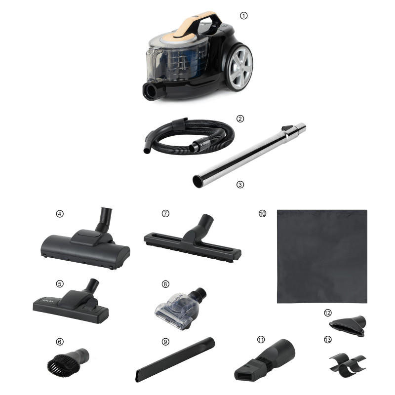 Į komplektą įeina: didelis universalus šepetys, parketo šepetys, mažas antgalis, apvalių šerelių šepetys, 2 viename plyšių antgalis, ilgas plyšių antgalis, teleskopinis vamzdis, didelis turbo šepetys, mini turbo šepetys, filtrų rinkinys, priedų laikiklis, maišelis
