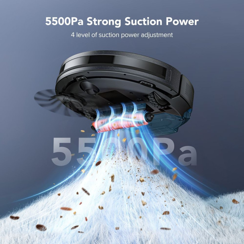 - Nepriekaištinga švara be pastangų: Dėl galingo 5500 Pa siurbimo ir automatinio galios reguliavimo pasiekite giliai išvalytas grindis ir kilimus – robotas efektyviai surenka visus nešvarumus, trupinius ir naminių gyvūnėlių plaukus.