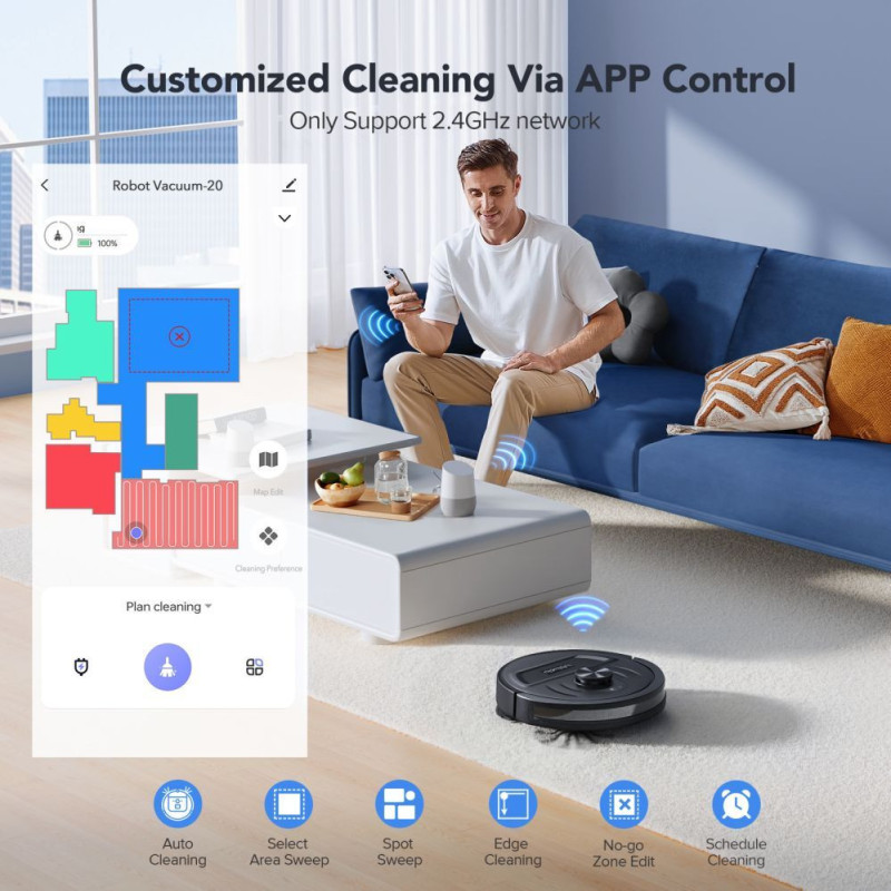 - Išmaniosios programėlės valdymas („Smart Life“ / „Tuya“): Leidžia planuoti valymo grafikus, sukurti iki 20 draudžiamų zonų ir 10 virtualių sienų bei nuotoliniu būdu reguliuoti nustatymus.
