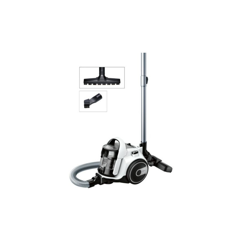 The Bosch Serie 2 BGS05A222 is a bagless cylinder vacuum cleaner for dry cleaning on hard floors and carpets. It has a 1.5 L dust container, a telescopic hose and a maximum power of 700 W.