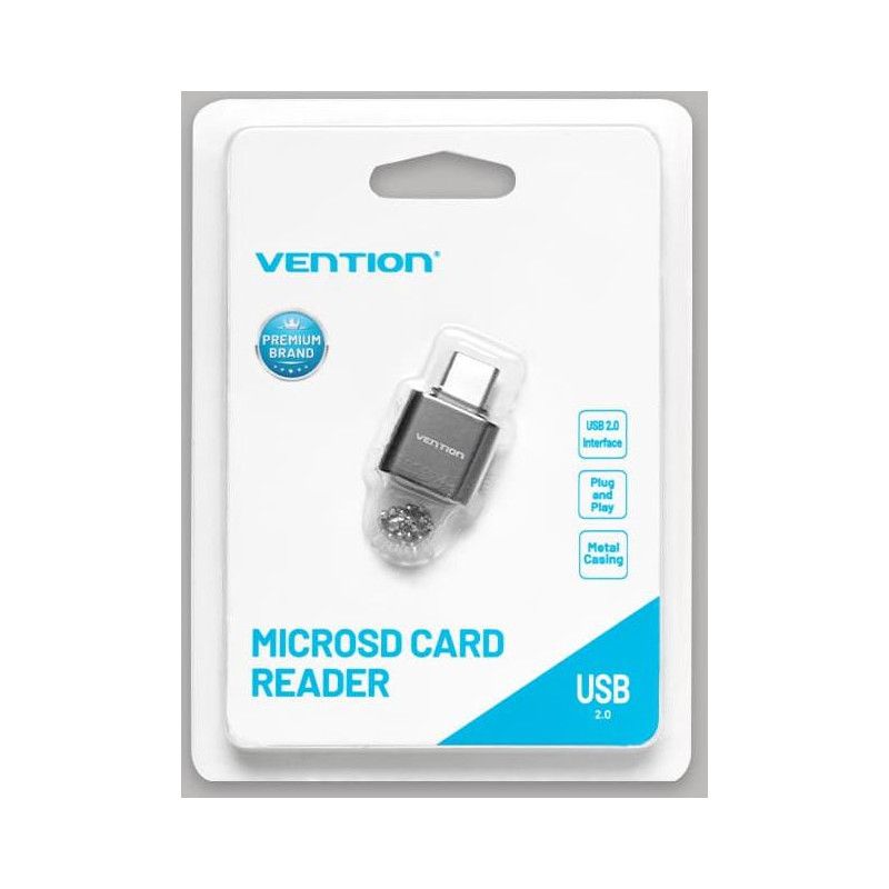 Summary Vention USB 2.0 Type-C MicroSD Card Reader Gray Zinc Alloy Type. Compatible memory cards: MicroSD (TransFlash), MicroSDXC, MicroSDHC, Product colour: Grey, Data transfer rate: 480 Mbit/s. Interface: USB 2.0 Type-C. Width: 15.7 mm, Depth: 9.9 mm, Height: 15.4 mm. Quantity per pack: 1 pc(s), Package type: Blister. Mac operating systems supported: MacOS, Mobile operating systems supported: iOS, Android