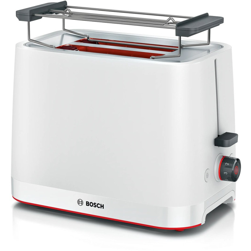 My Moment BOSCH TAT3M121 skrudintuvas turi atšildymo funkciją ir elektroninį rudos spalvos reguliavimą dviem riekelėms duonos. Jame yra nuimamas trupinių padėklas ir aukšto pakėlimo mechanizmas, leidžiantis lengvai pasiekti mažesnius gaminius.