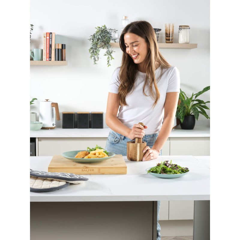 Medinė grūstuvė ir piestelė: skirta žolelėms, prieskoniams, sėkloms ir kt. smulkinti ir malti. Šis grūstuvės ir piestelės rinkinys puikiai tinka avokadams smulkinti gvakamolei arba prieskoniams malti kario pastai, todėl galėsite lengvai paruošti ingredientus!