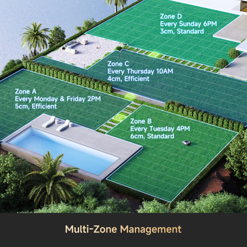 Puikiai tinkantis valdoms su atskirais priekiniais ir galiniais sodais, A2 leidžia kurti ir valdyti du nepriklausomus žemėlapius. Nustatykite atskirus pjovimo grafikus kiekvienai zonai – taip sutaupysite laiko ir nebereikės papildomos vejapjovės. Jis taip pat idealiai tinka kelių valdų savininkams.
