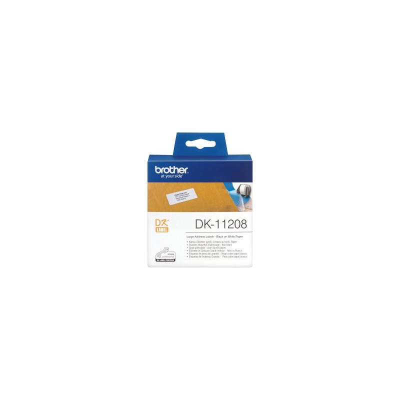 Brother DK-11208 yra iš anksto supjaustytų etikečių ritinėlis, turintis juodą tekstą ant baltos fono, tinkamas įvairioms etiketavimo užduotims. Šios savaiminės klijuojamos popierinės etiketės idealiai tinka siuntimui ir administracinėms reikmėms, užtikrinant aiškų ir profesionalų rezultatą.
