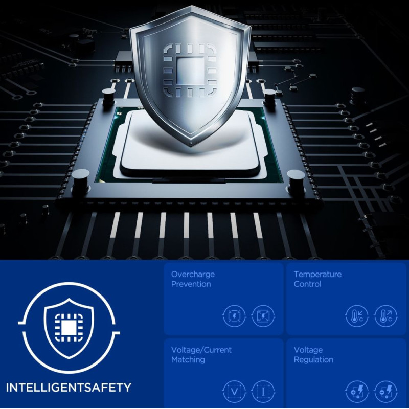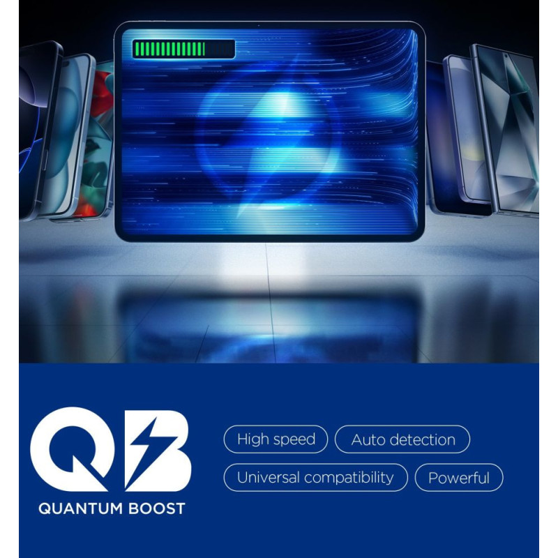 „Quantum Boost“ technologija automatiškai reguliuoja įkrovimo galią, kad atitiktų prijungtus įrenginius, maksimaliai padidindama jų efektyvumą. Integruotos perkrovų prevencijos, įtampos suderinimo ir įtampos reguliavimo funkcijos apsaugo įrenginius nuo perkrovų, per didelės įtampos ir nestabilios srovės, užtikrindamos saugų ir stabilų įkrovimą bet kokiomis sąlygomis.