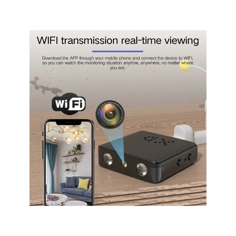 Specially designed mini XD WIFI portable camera, can be glued to any surface. Capture HD 1920x1080p video. Motion detection, loop recording, charging while recording, CMOS sensor. 90 degree shooting angle.