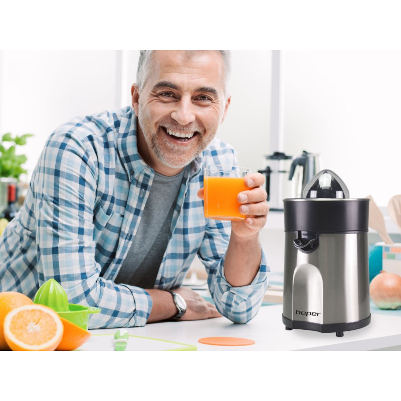 Elektrinė citrusinių vaisių sulčiaspaudė su plieniniu korpusu, indu su apsauga nuo lašėjimo, kad sultys tekėtų tiesiai į stiklinę. Pridedami du skirtingi kūgiai mažiems ir dideliems citrusiniams vaisiams. Įrengtas plieninėmis grotelėmis ir praktišku dulkių dangteliu. Lengva išardyti ir valyti, su neslystančiomis kojelėmis stabilumui užtikrinti.