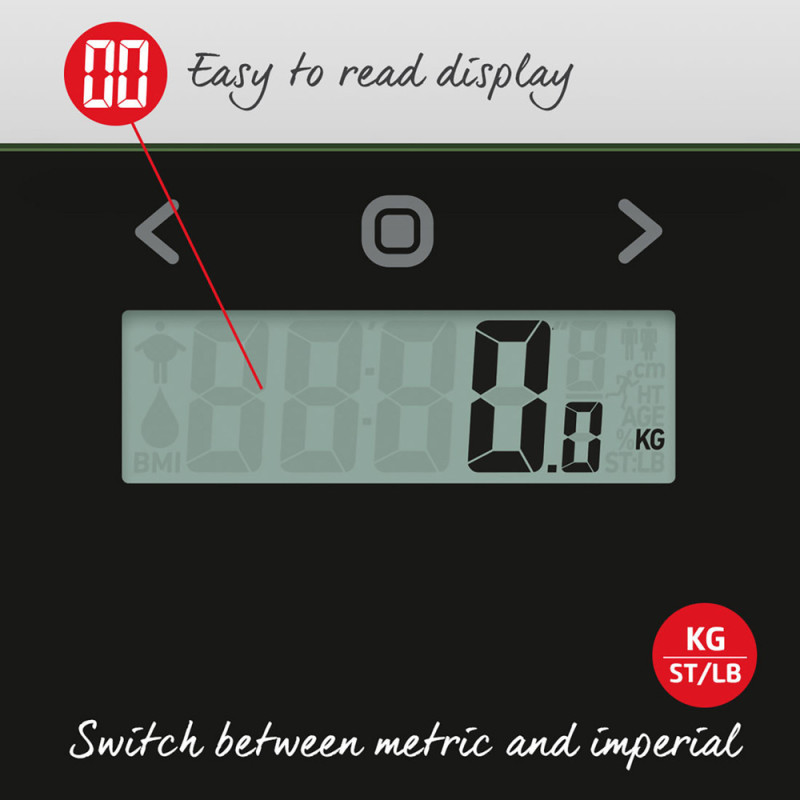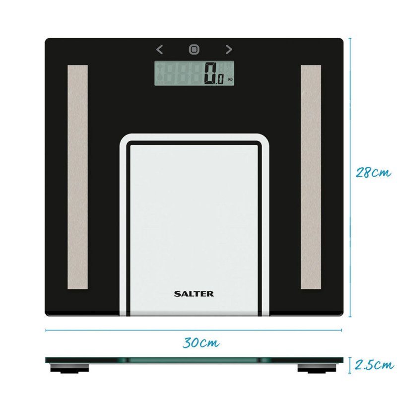Šios „Salter“ analizatorinės svarstyklės, turinčios sportininko režimą aktyviems vartotojams, taip pat matuoja kūno vandens kiekį, kūno riebalus ir KMI.