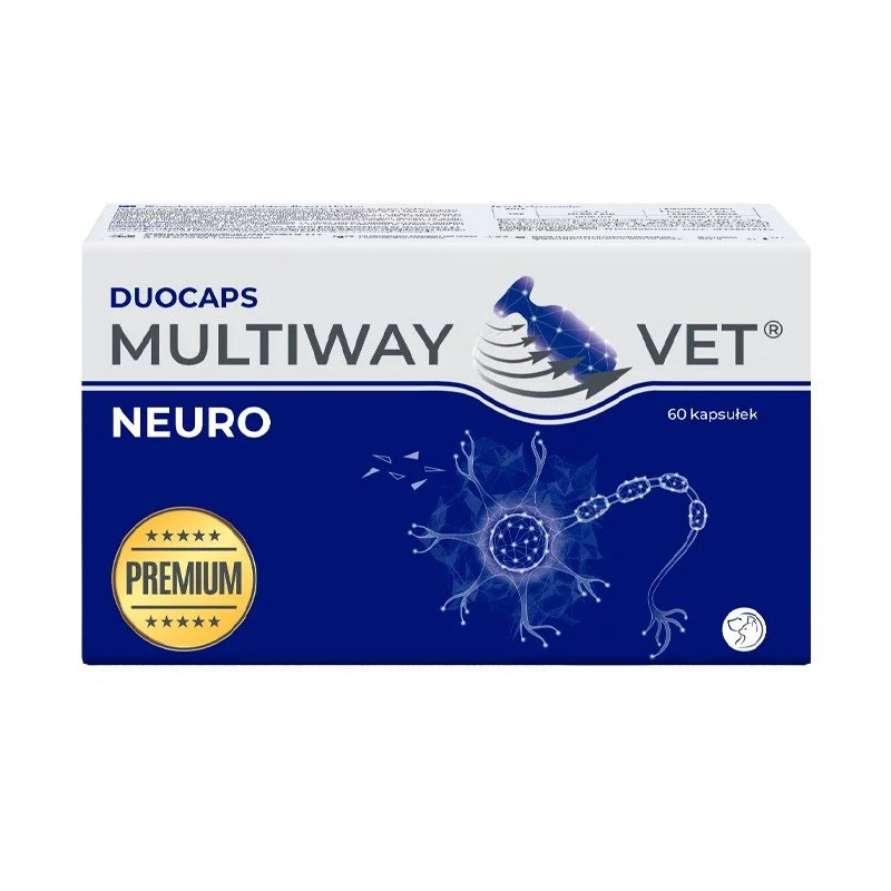 JM SANTE Multiway Vet Duocaps Neuro yra maisto papildai suaugusiems šunims ir katėms, skirti sumažinti nervinę įtampą. Produktas pateikiamas kartoninėje pakuotėje, kurioje yra 60 twist-off kapsulių.