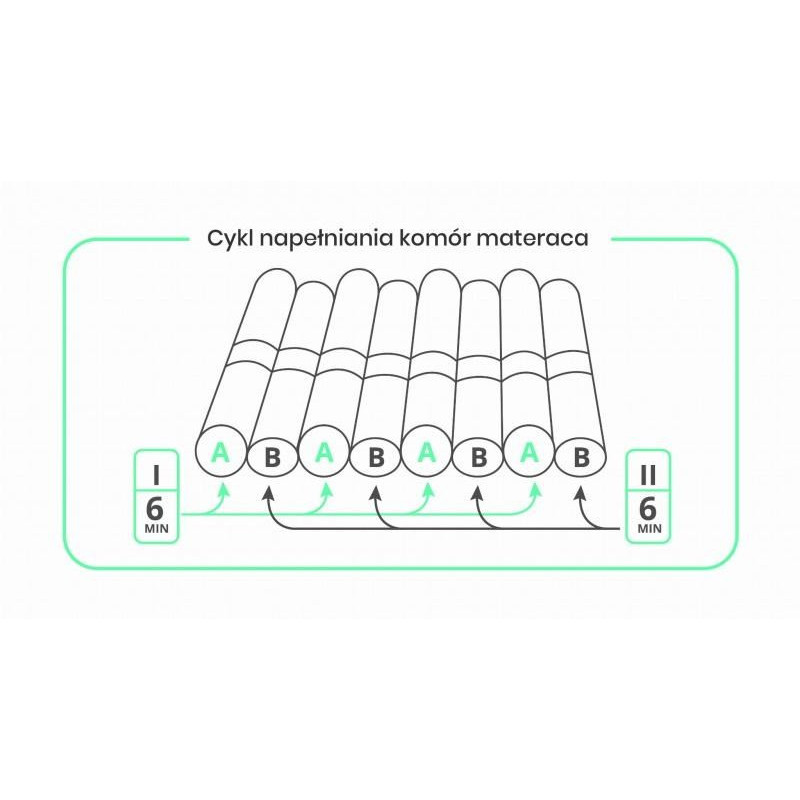 Antidekubito čiužinys turi 17 pneumatinės kamerų ir CPR saugos vožtuvą. Jis palaiko maksimalų naudotojo svorį iki 140 kg ir yra aprūpintas elektriniu oro siurbliu, kuris užtikrina lengvą pripūtimą.