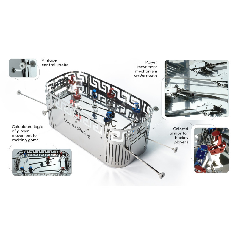 Rinkinyje yra surinkimo dalys, įrankių rinkinys ir vizualinis vadovas 12 kalbų. Žaidime yra šeši hokejaus žaidėjai, pagaminti iš poliruoto nerūdijančio plieno, matmenys 230 × 130 × 85 mm.