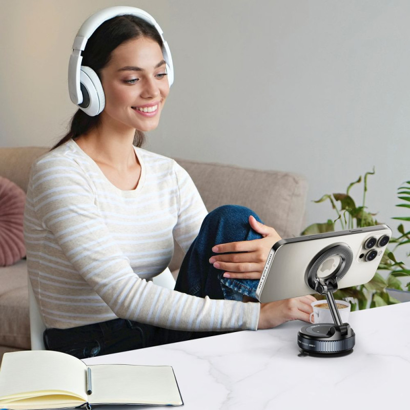 Laikiklis tvirtai laiko telefoną dėl įmontuotos magnetinės sistemos ir stabilaus siurbtuko, garantuodamas saugų pritvirtinimą tiek prie priekinio stiklo, tiek prie prietaisų skydelio. Kompaktiškas dizainas leidžia jį naudoti ir kitose vietose – virtuvėje, vonios kambaryje ar lauke.