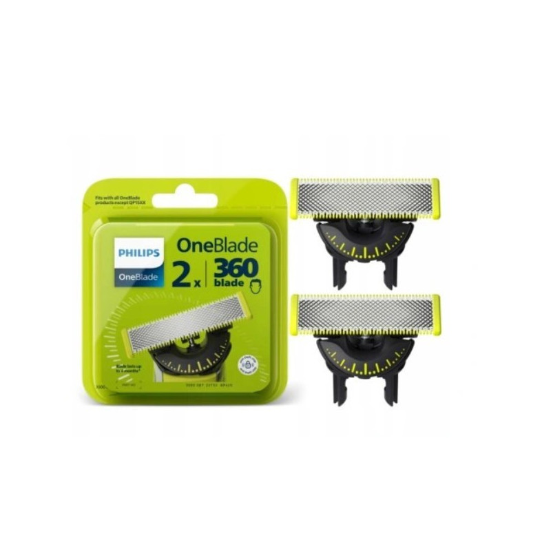 Pakeičiami skutimosi galvutės Philips Norelco OneBlade. Rinkinys apima dvi sidabrines galvutes, sukurtas efektyviam skutimuisi.