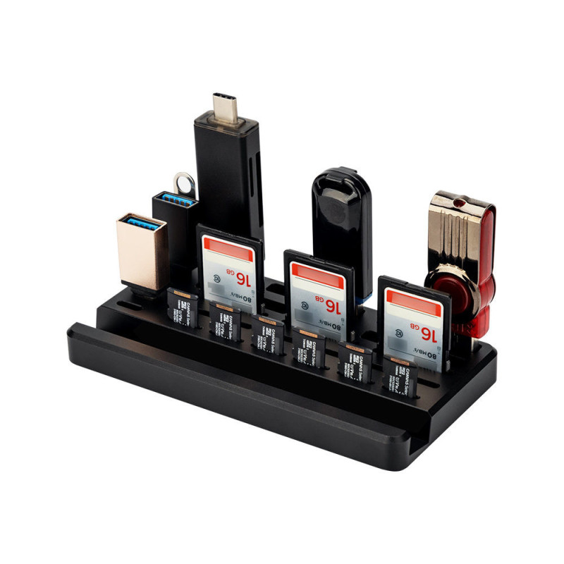 JJC UMS M1 Juodas Stalo Organizatorius yra aliuminio laikiklis, skirtas saugoti išmanųjį telefoną ir įvairias atminties korteles bei USB atmintines. Jame telpa 6 SD kortelės, 6 Micro SD kortelės, 10 USB A atmintinių ir 4 USB C atmintinės.