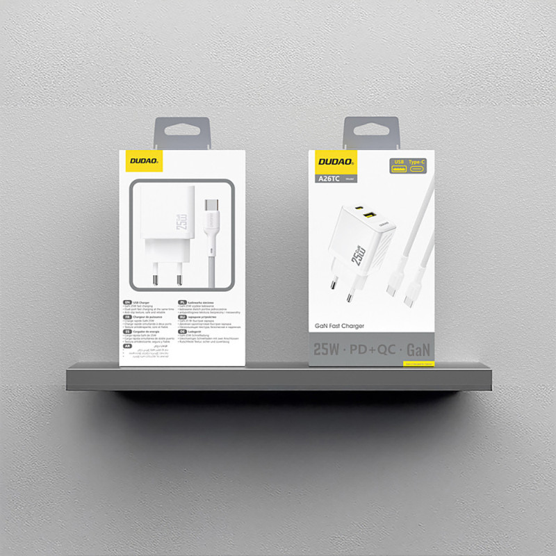 „Dudao A26TCEU“ sieninis įkroviklis yra modernus ir funkcionalus sprendimas greitam mobiliųjų įrenginių įkrovimui namuose, biure ir kelyje. „GaN“ technologija kartu su iki 25 W galia užtikrina didelį efektyvumą kompaktiškame dydyje. Du prievadai – USB-C ir USB-A – leidžia vienu metu įkrauti du įrenginius, o „Power Delivery“ ir „Quick Charge“ palaikymas sutrumpina įkrovimo laiką. Neslystanti korpuso tekstūra padidina naudojimo patogumą ir saugumą. Komplekte yra USB-C–USB-C laidas, todėl įkroviklis yra paruoštas naudoti iš karto išpakavus.