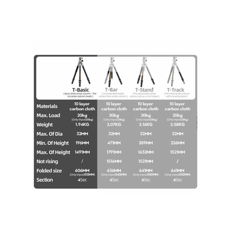 Fotopro T1 Plus+TH 1M+T Pagrindinis Foto Stovas yra lengvas ir patvarus stovas, pagamintas iš anglies pluošto, galintis atlaikyti iki 20 kg svorį. Jis turi maksimalų aukštį 1491 mm ir minimalų aukštį 196 mm, todėl yra universalus įvairioms fotografavimo sąlygoms.