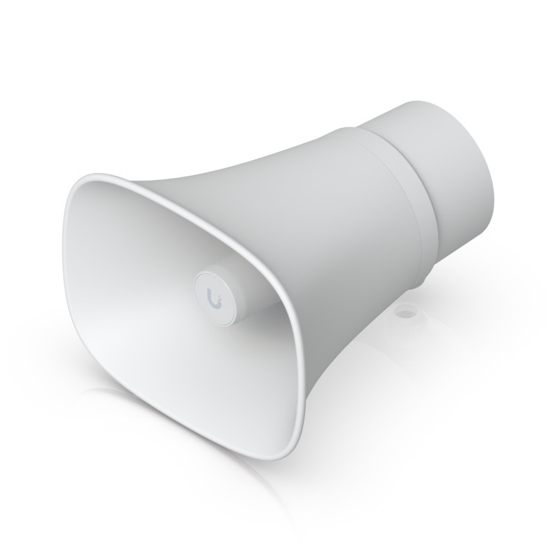 Smart Audio BroadcastingThe Ubiquiti AI Horn Speaker (model: UP-AI-Horn-Speaker-W) is a high-powered, intelligent network speaker built for real-time announcements in both indoor and outdoor environments. Integrated with the UniFi Access platform, it enables seamless deployment with other UniFi devices, offering advanced audio functionality through IP-based communication. The speaker supports AI-enhanced features such as text-to-speech, live paging, and pre-recorded announcements, making it ideal for public spaces, campuses, industrial zones, and security applications. Powered via 802.3af PoE, the device eliminates the need for a separate power source and simplifies installation. SIP protocol support allows it to integrate into VoIP paging systems, while compatibility with UniFi Talk and Protect enables centralized cloud-based management. The directional horn design ensures focused sound projection, delivering up to 100 dB at 1 meter with high clarity, perfect for specific zones like building entrances, corridors, or parking areas.