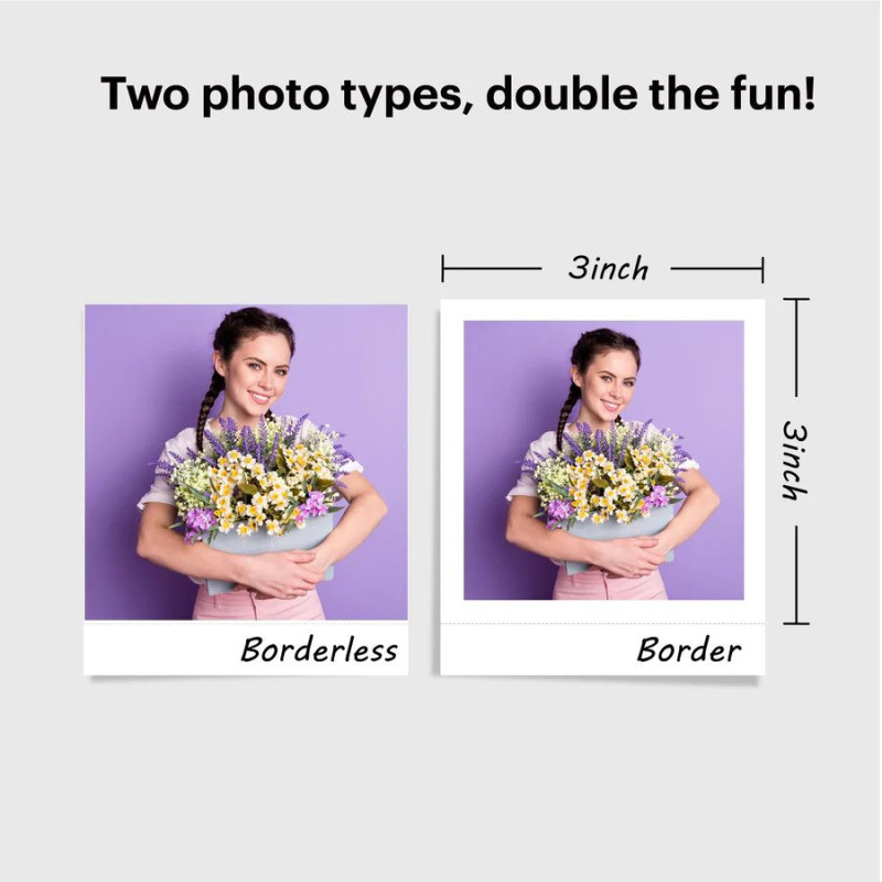 Du nuotraukų tipai: „Kodak Mini Shot 3 Retro“ nuotraukų spausdintuvu galima spausdinti tiek su rėmeliais, tiek be rėmelių. Su šiuo momentiniu fotoaparatu galite sukurti ilgalaikius prisiminimus, užrašydami juos rėmeliais. Jei norite, kad nuotraukos būtų didesnio formato, galite spausdinti be rėmelių.