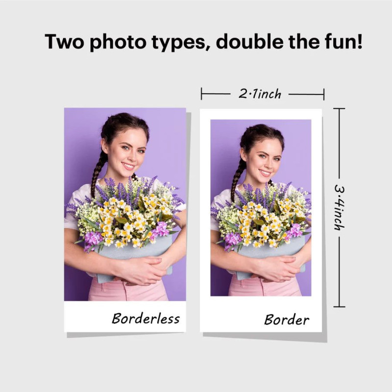 Du nuotraukų tipai: „Kodak Mini Shot 2 Retro“ nuotraukų spausdintuvu galima spausdinti tiek nuotraukas su rėmeliais, tiek be jų. Su šiuo momentiniu fotoaparatu galite sukurti ilgalaikius prisiminimus, užrašydami juos rėmeliais. Jei norite, kad nuotraukos būtų didesnio formato, galite spausdinti nuotraukas be rėmelių.