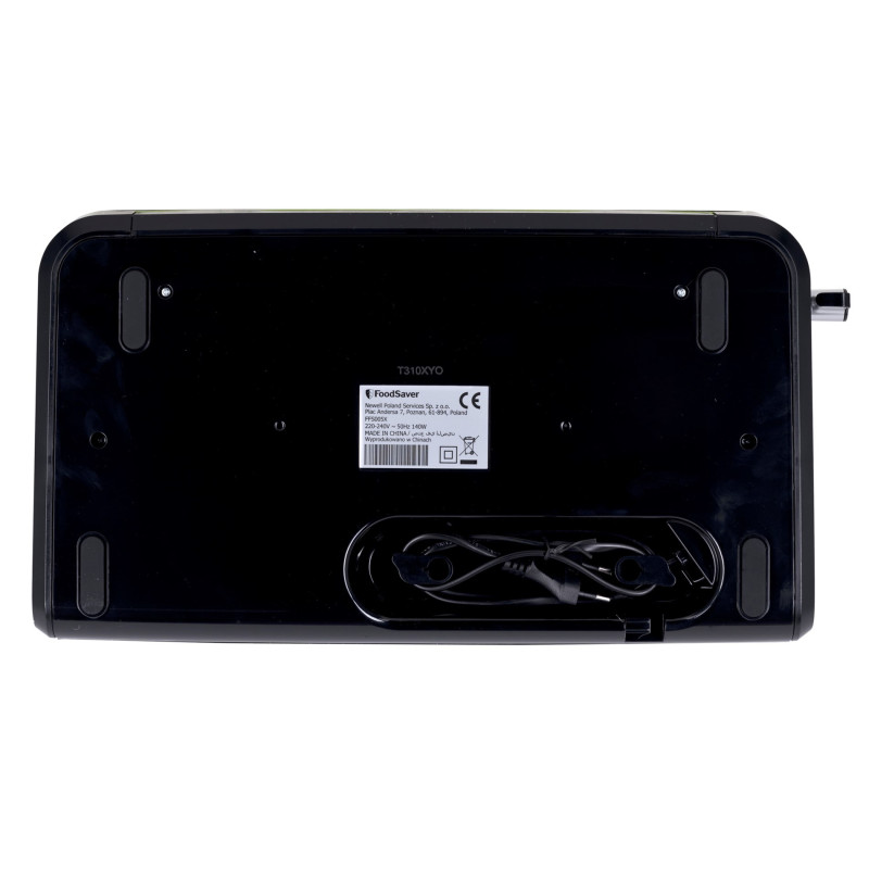 FoodSaver FFS005X yra kompaktiškas vakuuminis aparatas, skirtas namų naudojimui, pasižymintis 0.5 mbar vakuuminio sandarinimo našumu ir patvaria juodo nerūdijančio plieno konstrukcija.