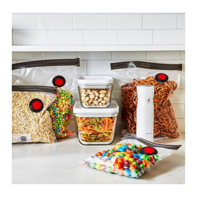 Zwilling Fresh & Save vakuuminių maišelių rinkinys - 49 cm (36800-305-0) apima tris stačiakampius maišelius, kurie užtikrina, kad jūsų maistas išliktų šviežias ilgiau. Pagaminti iš plastiko ir silikono derinio, šie hermetiški maišeliai yra tinkami šaldyti, garantuojant optimalų ingredientų išsaugojimą. Permatomas baltas dizainas leidžia lengvai matyti turinį, išlaikant jo kokybę.