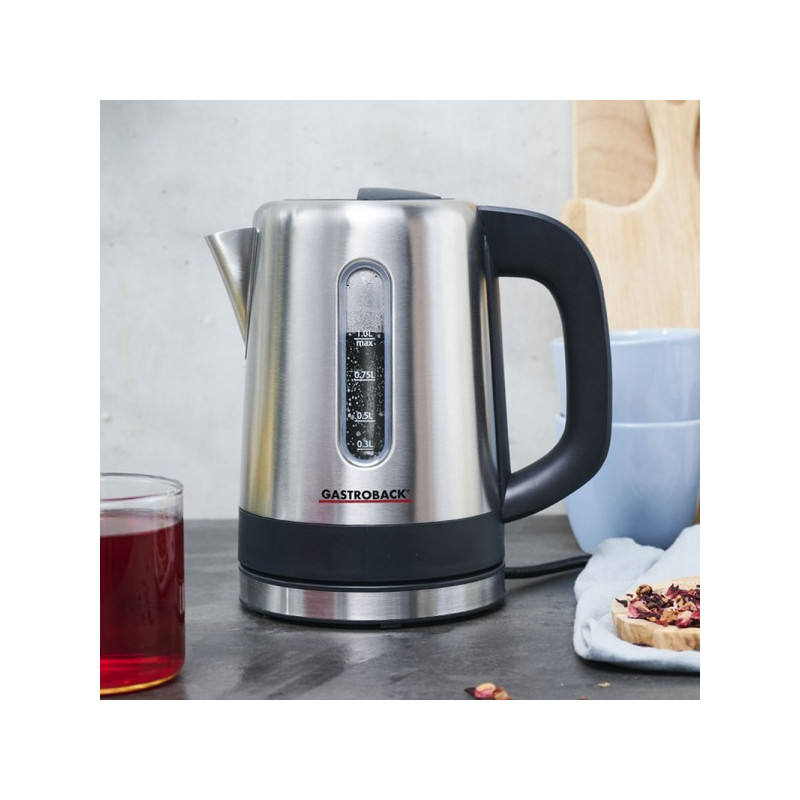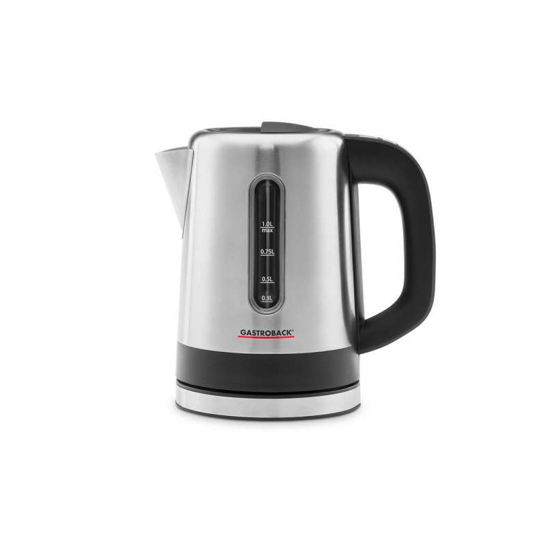 Nerūdijančio plieno indas, kurio tūris yra 1,0 litro, su užpildymo lygio indikatoriumi.