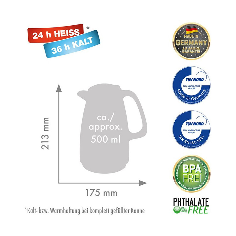Rotpunkt termosas talpina 1.5 litro ir išlaiko gėrimus karštus arba šaltus iki 24 valandų. Jo juodas dizainas turi rankeną ir paviršių, atsparų pirštų atspaudams, tačiau jis nėra tinkamas plauti indaplovėje.