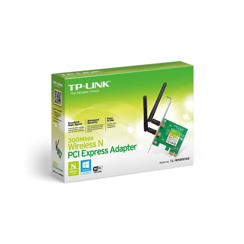 Belaidis N PCI Express 2.0(x1) adapteris TL-WN881ND leidžia prijungti stacionarų kompiuterį prie belaidžio tinklo ir pasiekti didelės spartos interneto ryšį. Atitinka IEEE 802.11n standartą, jie užtikrina iki 300 Mbps belaidžio ryšio greitį, o tai naudinga žaidžiant internetinius žaidimus ar net transliuojant HD vaizdo įrašus.