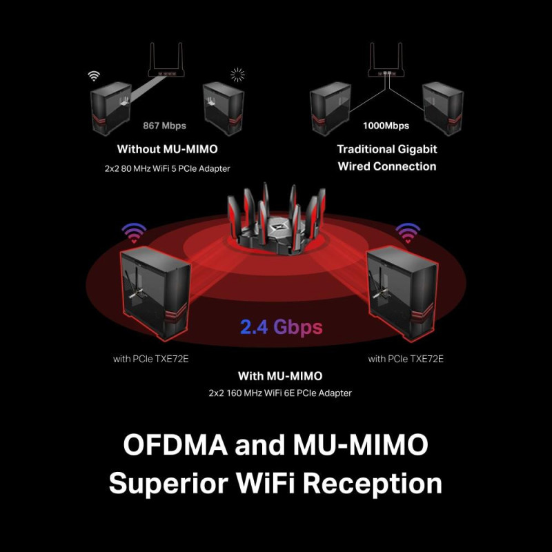 „Archer TXE72E“ maršrutizatorius pakelia jūsų kompiuterio „Wi-Fi“ ryšį į kitą lygį su revoliuciniu OFDMA ir MU-MIMO deriniu. Tai užtikrina jūsų kompiuterio „Wi-Fi“ ryšio efektyvumą, leisdamas daugiau įrenginių vienu metu bendrauti su jūsų maršrutizatoriumi, o ne laukti duomenų paeiliui.