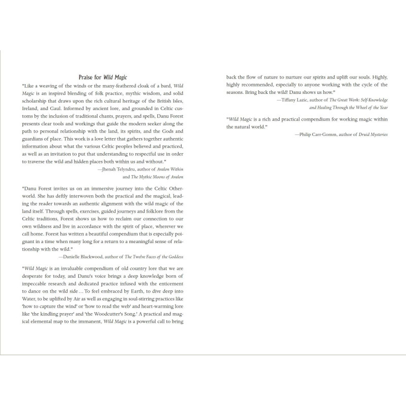 Įtraukiantis keltų magijos ir laukinės jūsų širdies išminties vadovas. Ši knyga yra magijos ir dvasinės istorijos bei praktinių žinių, pagrįstų senomis keltų tradicijomis, sandėlis. Pripildyta praktinių pratimų ir gilių meditacijų, laukinė magija parodys, kaip pasiekti anapusinį pasaulį ir užmegzti gilų ryšį su dieviškąją prigimtį. Autorius Danu Forestas tyrinėja nesenstančias animistines keltų fėjų tikėjimo praktikas, kurdamas ryšius su fėjų liaudininkais, žaliaisiais giminaičiais, protėviais ir krašto dvasiomis. Išmoksite pasikviesti savo dvasių pusbrolius apsaugai, ir praktikuosite magiškas technikas, pagrįstas stichijomis, pavyzdžiui, ugnies šauksmą ir burtus, kad pakeltumėte vėją. Atraskite ley linijų, drakonų linijų, pasakų kelių ir dvasių takų paslaptis, kurios pakeis jūsų gyvenimą čia ir dabar. Pasinaudokite Danu patarimais, kaip gaminti laukinius amatus, ir jos unikaliais receptais, kaip gaminti stebuklingus aliejus, tepalus, ryšulius ir tepalus su įprastomis žolelėmis. Iš autentiškos šalies išminties ir Airijos, Škotijos bei Velso liaudies tradicijų paimti burtai ir ritualai yra sukurti taip, kad jūsų šiuolaikinis laukinis gyvenimas būtų naudingas visiems.