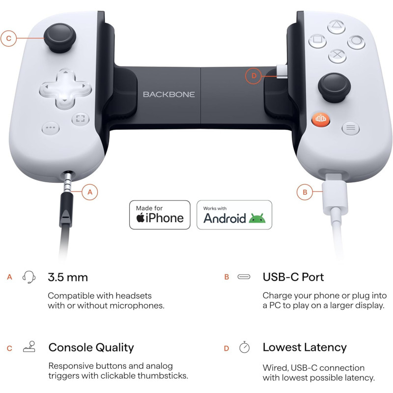 Backbone One (2-oji karta) USB-C PlayStation leidimas yra baltas mobilus valdiklis, sukurtas iPhone 15/16 serijai ir Android įrenginiams. Jame yra Hall efektą naudojantys jutikliai, kurie pagerina magnetinių adapterių veikimą, ir pertvarkyta D-forma. Valdiklis siūlo itin mažą vėlavimą per tiesioginį USB-C ryšį, galimybę įkrauti per prievadą ir 3,5 mm ausinių lizdą.