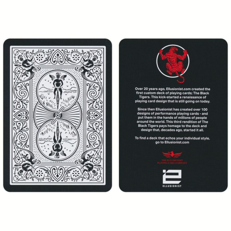 Kaip ir mada, kažkas yra šaunu, kol visi to neturi, o tada apie tai pamirštama. Po daugelio metų tie, kurie jį atgaivina, laikomi šauniais, nes išsiskirti galima turėti kažką, kas pažeidžia modelį ir griauna standartą. Juodieji tigrai yra tie, kurie pertraukia modelį. Juoda kortų kaladė balto popieriaus jūroje. Vos įdėtas į visiškai naują, nostalgišką dėklą, yra nuožmus ir didžiulis dizainas. Tai yra kaladė, nuo kurios viskas prasidėjo. Šiose "Black Tiger" atgimimo kortose yra 56 pokerio dydžio kortos, įskaitant 2 "Jokers" + 1 dvigubos nugarėlės ir 1 "Ellusionist". "Black Tiger: Revival Edition" žaidimo kortas sukūrė JAV "The Ellusionist Playing Card Company" ir atspausdino ant Thin Crushed © Stock, kurią sukūrė JAV žaidimų kortų kompanija.
