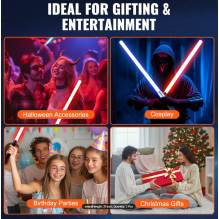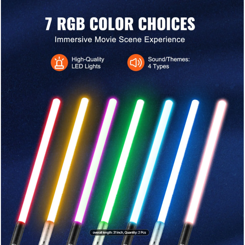 RGB Lightsaber 75 cm – realistiškas lazerinis kardas su 7 keičiamomis spalvomis, metaline rankena, garso efektais ir smūgio šviesos reakcija. Puikiai tinka cosplay, kostiumų vakarėliams, kolekcionavimui ar dvikovų treniruotėms. Kardas turi tvirtą metalinę rankeną ir patvarų polikarbonato ašmenį, todėl gali atlaikyti intensyvesnius judesius ir kovas.