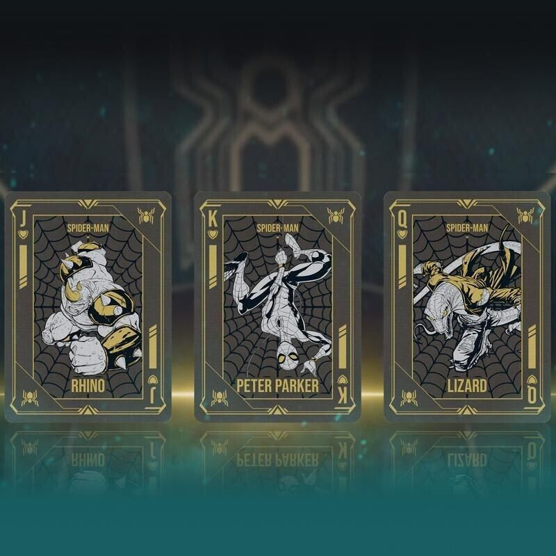 Patirkite jauduli vorą su Žmogaus-voro juodos ir auksinės spalvos žaidimo kortomis. Pasiruoškite įeiti į žavų Peterio Parkerio, dar žinomo kaip Žmogus-voras, pasaulį su Žmogaus-voro juodomis ir auksinėmis žaidimo kortomis. Unikali kortų kaladė yra įkvėpta Žmogaus-voro juodos ir auksinės spalvos kostiumo su juodos ir auksinės spalvos plokštėmis ir yra aktyvuota mistinių galių, kurios gražiai užfiksuotos kortų kaladėje. Inovatyvi atidarymo/uždarymo sistema, įjungianti kostiumo šviesos diodą. LED šviesos centras keičia spalvą iš mėlynos į auksinę, suaktyvindamas kostiumo "mistines galias". LED lemputės veikia daugiau nei 100 000 sekundžių. Su visiškai atnaujinta lengvai pakeičiama akumuliatoriaus keitimo sistema. Baterijos įtrauktos. Sukurta profesionalams, turintiems kazino kokybę.