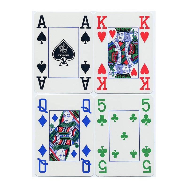 Copag 4 Spalvų Jumbo Indekso pokerio kortos pagamintos iš 100% PVC plastiko ir turi unikalų keturių spalvų dizainą. Komplekte yra 52 kortos ir 2 juokdariai, kurių matmenys yra 63,5 x 88,9 mm, o svoris - 135 g.