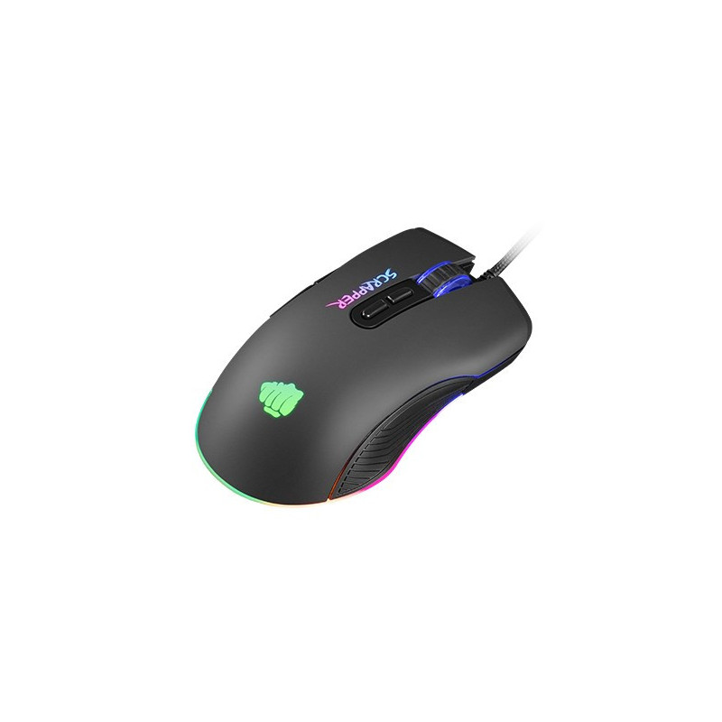 The FURY Scrapper mouse features an ambidextrous design with a 6400 DPI optical sensor and 5 programmable buttons. It has a 1.6m cable, multi-color lighting, and is compatible with a variety of operating systems, including Windows and Linux.